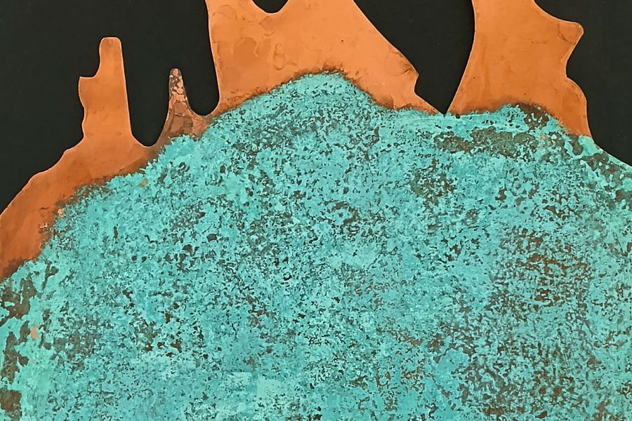 Marlies Schulte führt die historische Linie der Materialabstraktion auf völlig originelle Weise mit ihrer eigenen Technik fort. Sie setzt Kupfer- und Messingplatten chemischen Mitteln aus, die die Oxidation und andere chemische Prozesse beschleunigen und so die Oberflächenstruktur der Platte und gleichzeitig die Farbe des Metalls verändern. Alle haptischen und optischen Veränderungen auf der Oberfläche der Metallplatte sind ausschließlich das Ergebnis chemischer Reaktionen, die durch die Wahl des Mittels, die Festlegung der Ausgangsbedingungen und die Dauer des Prozesses bestimmt werden. Mechanische Eingriffe nutzt die Künstlerin lediglich, um die unregelmäßigen Konturen der Metallplatte zu definieren, die sie dann an einen homogenen schwarzen Hintergrund anpasst. Die Ergebnisse ihrer Methode sind faszinierend.