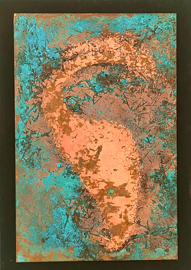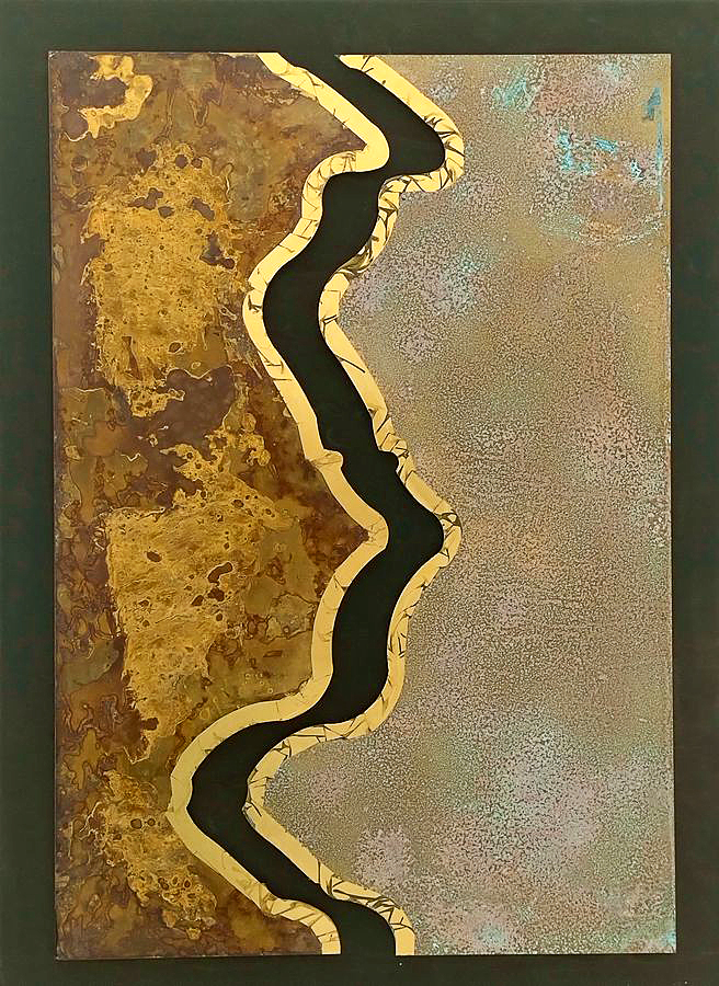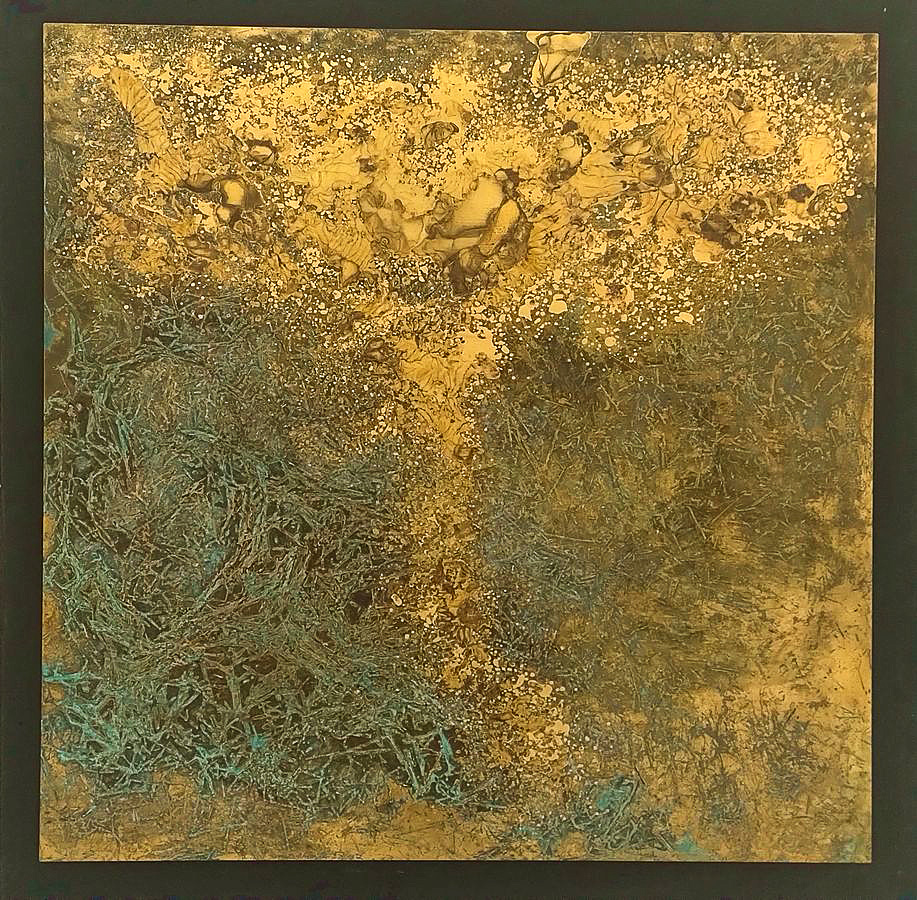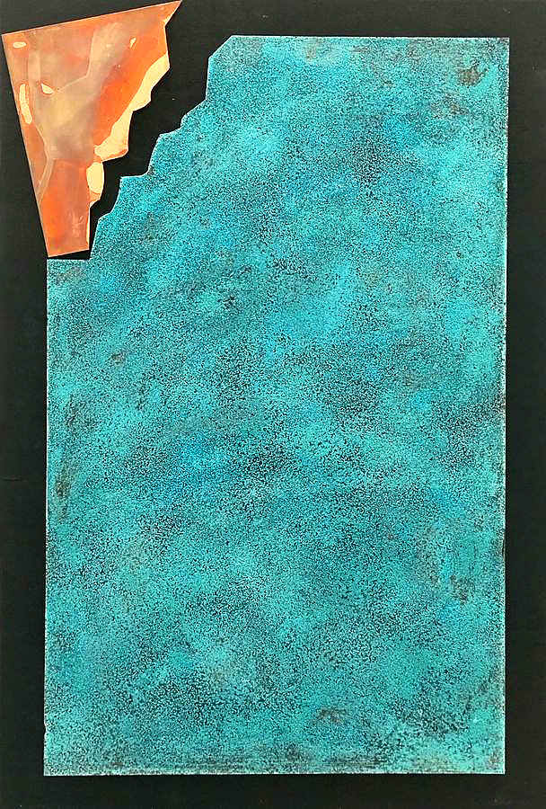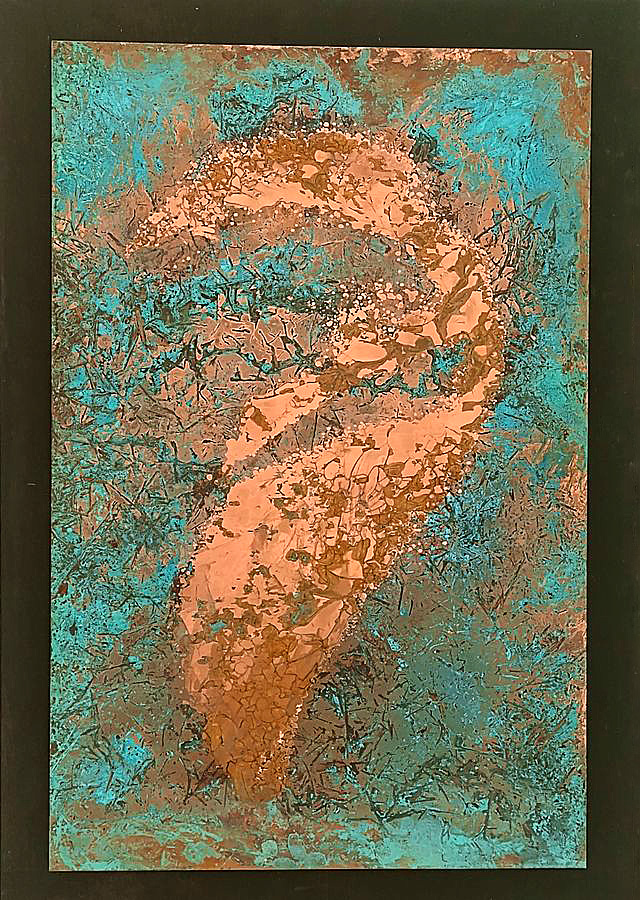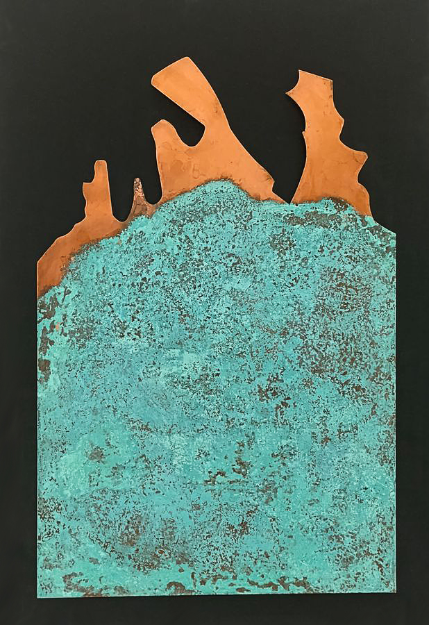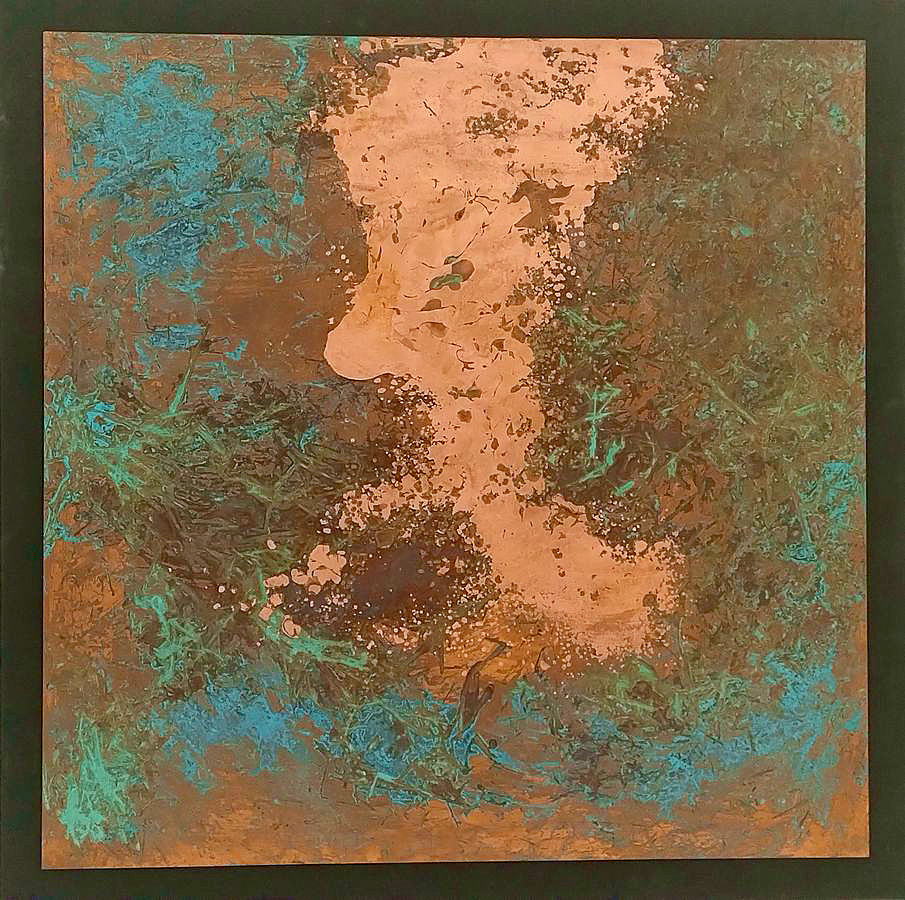 Marlies Schulte führt die historische Linie der Materialabstraktion auf völlig originelle Weise mit ihrer eigenen Technik fort. Sie setzt Kupfer- und Messingplatten chemischen Mitteln aus, die die Oxidation und andere chemische Prozesse beschleunigen und so die Oberflächenstruktur der Platte und gleichzeitig die Farbe des Metalls verändern. Alle haptischen und optischen Veränderungen auf der Oberfläche der Metallplatte sind ausschließlich das Ergebnis chemischer Reaktionen, die durch die Wahl des Mittels, die Festlegung der Ausgangsbedingungen und die Dauer des Prozesses bestimmt werden. Mechanische Eingriffe nutzt die Künstlerin lediglich, um die unregelmäßigen Konturen der Metallplatte zu definieren, die sie dann an einen homogenen schwarzen Hintergrund anpasst. Die Ergebnisse ihrer Methode sind faszinierend.